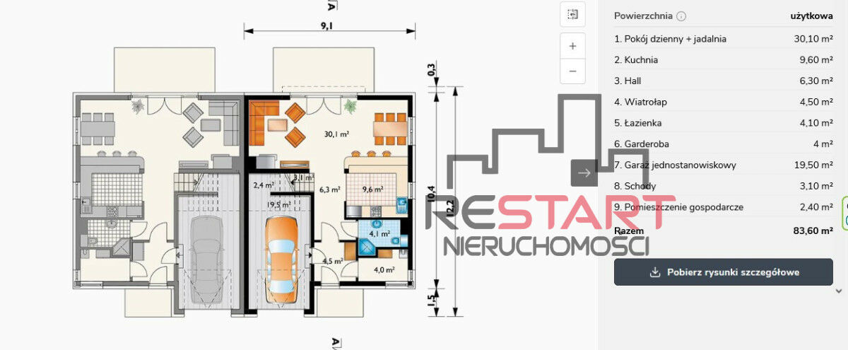Garaż jednostanowiskowy (19,50 m²) - w bryle budynku.